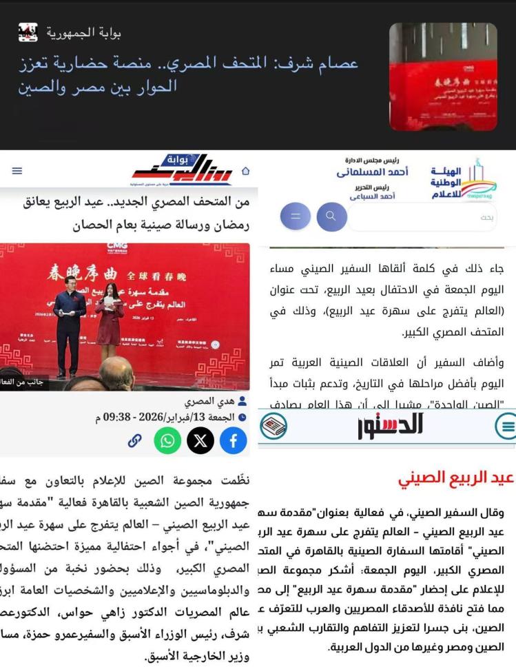 埃及國(guó)有媒體管理局官網(wǎng)以及開(kāi)羅新聞電視臺(tái)、尼羅河電視臺(tái)、中東通訊社、《金字塔報(bào)》《共和國(guó)報(bào)》《今日埃及人報(bào)》《七日?qǐng)?bào)》《憲章報(bào)》《魯茲優(yōu)素福》雜志等埃主流媒體對(duì)活動(dòng)進(jìn)行了報(bào)道。