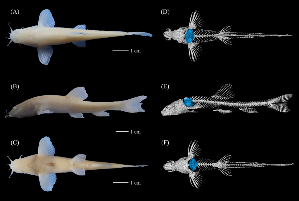 這是“納雍盲高原鰍”的外形及骨骼對比圖,研究人員從背面、側(cè)面以及腹面對這一新種的外形和內(nèi)部骨骼進(jìn)行了對比。(受訪者供圖)