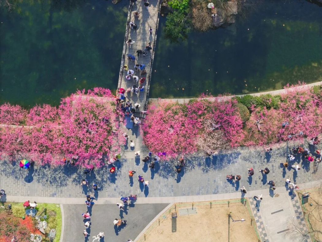 在江南水鄉(xiāng),早春的序曲總是由梅花奏響。江蘇常州便是這抹春色里最具代表性的剪影。龍城正月,古運(yùn)河畔紅燈籠高掛,紅梅公園內(nèi),唐代紅梅閣翹角飛檐,閣前紅梅燦若云霞,恰如趙翼詩中所繪的盛景。這里的賞梅,早已不是單純的游園,而是一場雅俗共賞的年俗盛會。文旅IP“常寶"穿梭送福,打卡點(diǎn)紅燈籠高懸,大年初一的市集上,手作、梅花好物琳瑯滿目,糖畫、梅花酥香氣四溢,文筆塔的花瀑氛圍拉滿,市民在梅香與煙火氣中收獲新春幸福。