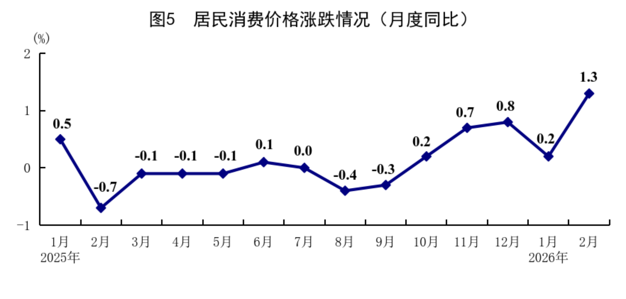 1—2月份,全國(guó)居民消費(fèi)價(jià)格(CPI)同比上漲0.8%,其中1月份上漲0.2%,2月份上漲1.3%。分類別看,1—2月份,食品煙酒及在外餐飲價(jià)格同比上漲0.6%,衣著價(jià)格上漲1.9%,居住價(jià)格下降0.1%,生活用品及服務(wù)價(jià)格上漲2.7%,交通通信價(jià)格下降2.1%,教育文化娛樂價(jià)格上漲1.0%,醫(yī)療保健價(jià)格上漲1.8%,其他用品及服務(wù)價(jià)格上漲14.3%。在食品煙酒及在外餐飲價(jià)格中,豬肉價(jià)格下降11.2%,糧食價(jià)格下降0.2%,鮮果價(jià)格上漲4.5%,鮮菜價(jià)格上漲8.8%。扣除食品和能源價(jià)格后的核心CPI同比上漲1.3%。從環(huán)比看,1月份,全國(guó)居民消費(fèi)價(jià)格上漲0.2%,2月份上漲1.0%。