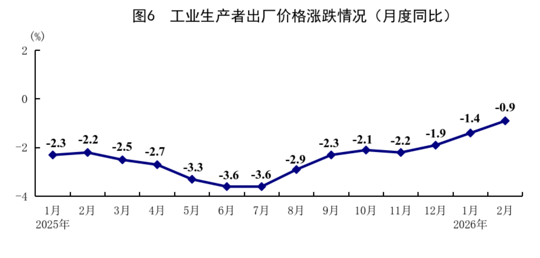 1—2月份,全國(guó)工業(yè)生產(chǎn)者出廠價(jià)格同比下降1.2%。分月看,1月份同比下降1.4%,環(huán)比上漲0.4%;2月份同比下降0.9%,環(huán)比上漲0.4%。1—2月份,全國(guó)工業(yè)生產(chǎn)者購(gòu)進(jìn)價(jià)格同比下降1.1%。