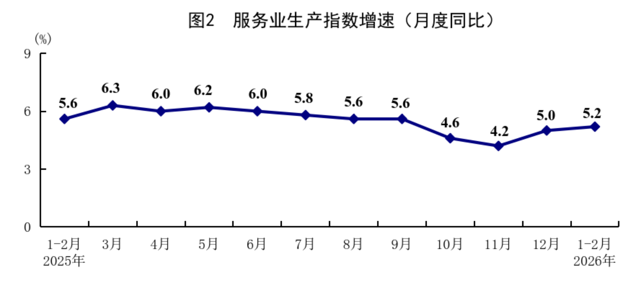 1—2月份,全國(guó)服務(wù)業(yè)生產(chǎn)指數(shù)同比增長(zhǎng)5.2%,比上年12月份加快0.2個(gè)百分點(diǎn)。分行業(yè)看,信息傳輸、軟件和信息技術(shù)服務(wù)業(yè),租賃和商務(wù)服務(wù)業(yè),金融業(yè),交通運(yùn)輸、倉(cāng)儲(chǔ)和郵政業(yè),住宿和餐飲業(yè)生產(chǎn)指數(shù)分別增長(zhǎng)10.1%、8.2%、7.0%、6.3%、5.4%。2月份,服務(wù)業(yè)商務(wù)活動(dòng)指數(shù)為49.7%,比上月上升0.2個(gè)百分點(diǎn);服務(wù)業(yè)業(yè)務(wù)活動(dòng)預(yù)期指數(shù)為55.8%。其中,住宿、餐飲、文化體育娛樂等行業(yè)商務(wù)活動(dòng)指數(shù)位于60.0%以上高位景氣區(qū)間。