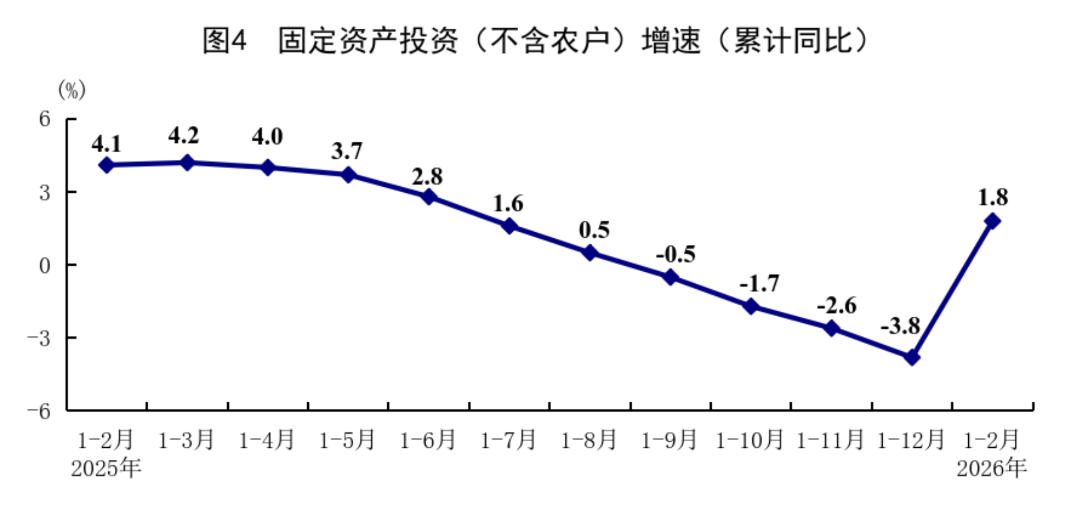 1—2月份,全國(guó)固定資產(chǎn)投資(不含農(nóng)戶)52721億元,同比增長(zhǎng)1.8%,上年全年為下降3.8%;扣除房地產(chǎn)開發(fā)投資,全國(guó)固定資產(chǎn)投資增長(zhǎng)5.2%。分領(lǐng)域看,基礎(chǔ)設(shè)施投資同比增長(zhǎng)11.4%,制造業(yè)投資增長(zhǎng)3.1%,房地產(chǎn)開發(fā)投資下降11.1%。全國(guó)新建商品房銷售面積9293萬(wàn)平方米,同比下降13.5%;新建商品房銷售額8186億元,下降20.2%。分產(chǎn)業(yè)看,第一產(chǎn)業(yè)投資同比增長(zhǎng)17.4%,第二產(chǎn)業(yè)投資增長(zhǎng)5.4%,第三產(chǎn)業(yè)投資下降0.4%。民間投資同比下降2.6%,降幅比上年全年收窄3.8個(gè)百分點(diǎn);扣除房地產(chǎn)開發(fā)投資,民間投資增長(zhǎng)1.0%。高技術(shù)產(chǎn)業(yè)投資同比增長(zhǎng)5.1%,其中航空、航天器及設(shè)備制造業(yè),研發(fā)與設(shè)計(jì)服務(wù)業(yè),信息服務(wù)業(yè)投資分別增長(zhǎng)20.2%、20.6%、16.5%。從環(huán)比看,2月份固定資產(chǎn)投資(不含農(nóng)戶)比上月增長(zhǎng)0.39%。