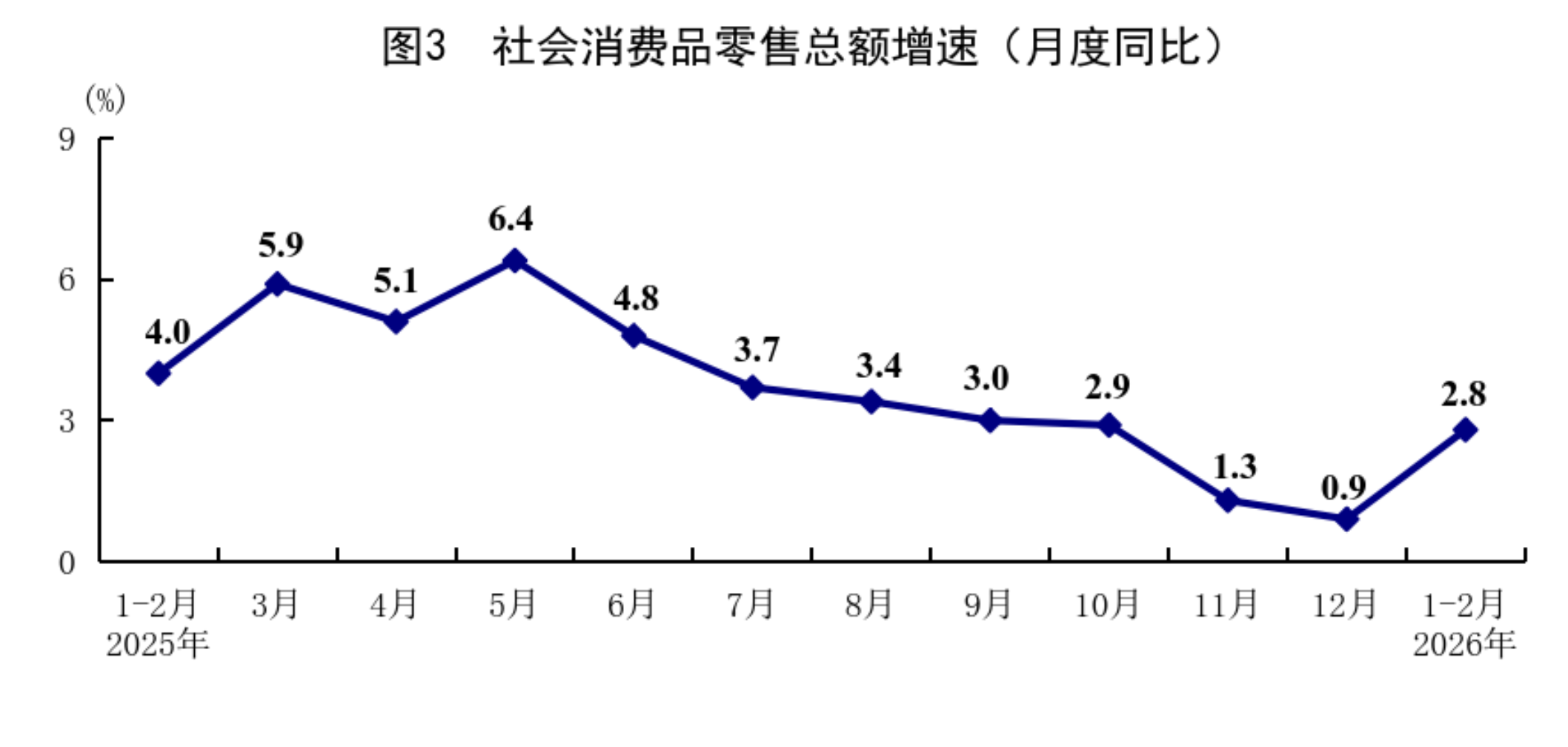 1—2月份,社會(huì)消費(fèi)品零售總額86079億元,同比增長(zhǎng)2.8%,比上年12月份加快1.9個(gè)百分點(diǎn)。按經(jīng)營(yíng)單位所在地分,城鎮(zhèn)消費(fèi)品零售額74449億元,增長(zhǎng)2.7%;鄉(xiāng)村消費(fèi)品零售額11630億元,增長(zhǎng)3.2%。按消費(fèi)類型分,商品零售額75815億元,增長(zhǎng)2.5%;餐飲收入10264億元,增長(zhǎng)4.8%?;旧铑惡筒糠稚?jí)類商品銷售增長(zhǎng)較快。限額以上單位服裝鞋帽針紡織品類、糧油食品類、通訊器材類、金銀珠寶類商品零售額同比分別增長(zhǎng)10.4%、10.2%、17.8%、13.0%。從環(huán)比看,2月份社會(huì)消費(fèi)品零售總額比上月增長(zhǎng)0.81%。1—2月份,服務(wù)零售額同比增長(zhǎng)5.6%,比上年全年加快0.1個(gè)百分點(diǎn)。其中,通訊信息服務(wù)類、旅游咨詢租賃服務(wù)類、文體休閑服務(wù)類零售額較快增長(zhǎng)。1—2月份,全國(guó)網(wǎng)上商品和服務(wù)零售額32546億元,同比增長(zhǎng)9.2%。其中,網(wǎng)上商品零售額20812億元,增長(zhǎng)10.3%,占社會(huì)消費(fèi)品零售總額的比重為24.2%;網(wǎng)上服務(wù)零售額11734億元,增長(zhǎng)7.3%。