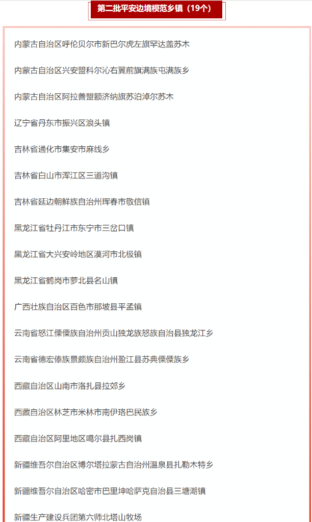 19個第二批平安邊境模范鄉(xiāng)鎮(zhèn)名單。(國家移民管理局微信公眾號截圖)