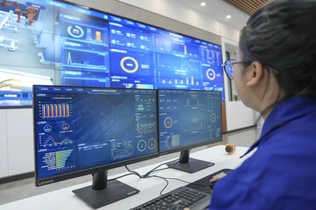 技術(shù)人員在數(shù)字化車間集控中心監(jiān)視生產(chǎn)系統(tǒng)運(yùn)行數(shù)據(jù)。新華社記者 王松 攝