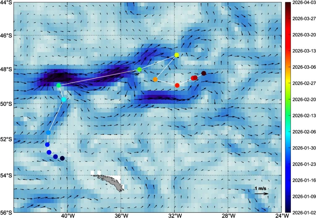 風(fēng)云衛(wèi)星監(jiān)測(cè)的A23a冰山漂移路徑(圓點(diǎn)為冰山位置,時(shí)間與右側(cè)標(biāo)注對(duì)應(yīng);圖底色和箭頭表示洋流)。(中國(guó)氣象局供圖)