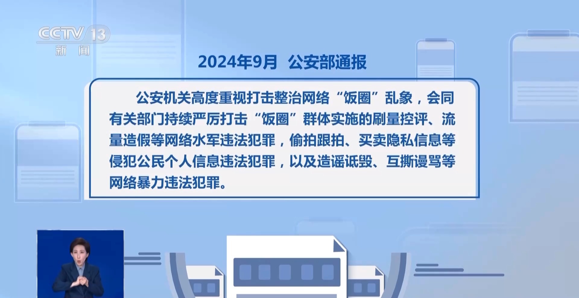 2024年9月,公安部通報,公安機(jī)關(guān)高度重視打擊整治網(wǎng)絡(luò)“飯圈”亂象,會同有關(guān)部門持續(xù)嚴(yán)厲打擊“飯圈”群體實施的刷量控評、流量造假等網(wǎng)絡(luò)水軍違法犯罪,偷拍跟拍、買賣隱私信息等侵犯公民個人信息違法犯罪,以及造謠詆毀、互撕謾罵等網(wǎng)絡(luò)暴力違法犯罪。