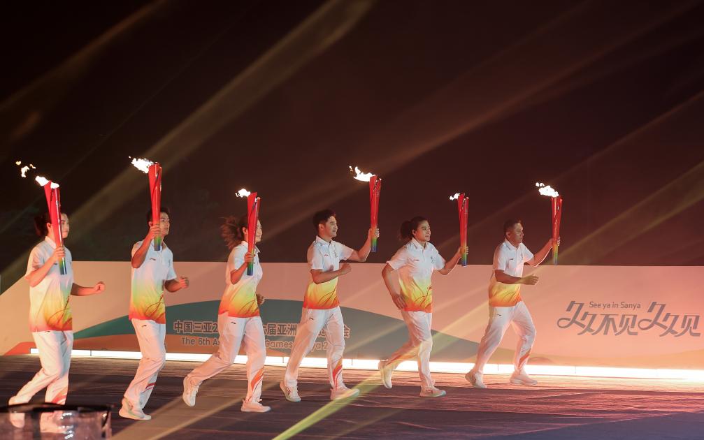 舞臺(tái)遠(yuǎn)端,六名火炬手——乒乓球大滿貫得主丁寧、跳水奧運(yùn)冠軍田亮、女籃亞運(yùn)冠軍王麗麗、攀巖世錦賽冠軍龍見國、帆船運(yùn)動(dòng)員卓月桃和帆板教練員陳哲,高擎火炬奔跑而來。