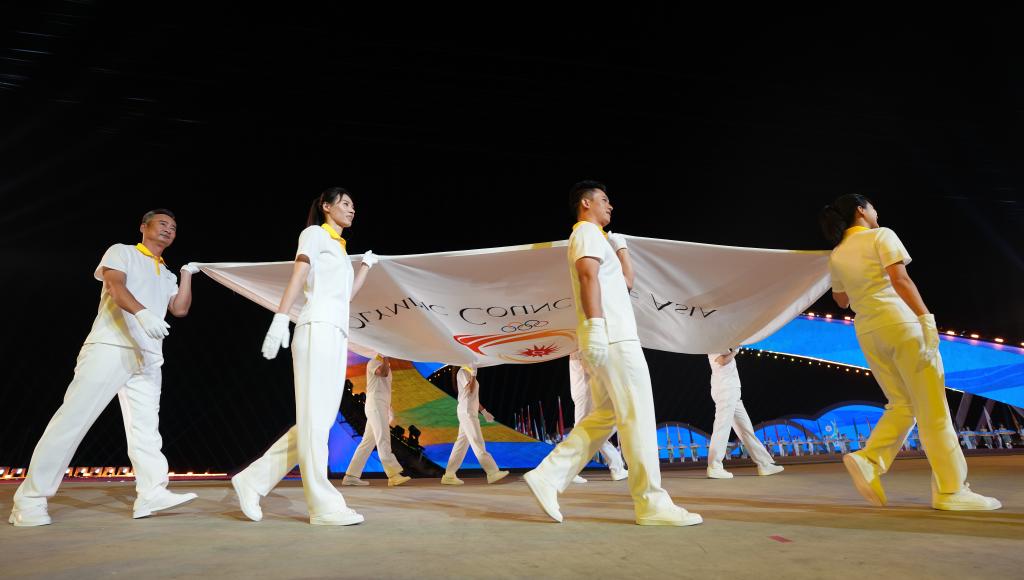 跳水奧運(yùn)冠軍李娜等8人執(zhí)亞奧理事會(huì)會(huì)旗入場(chǎng)。亞奧理事會(huì)會(huì)歌奏響,會(huì)旗緩緩升起。