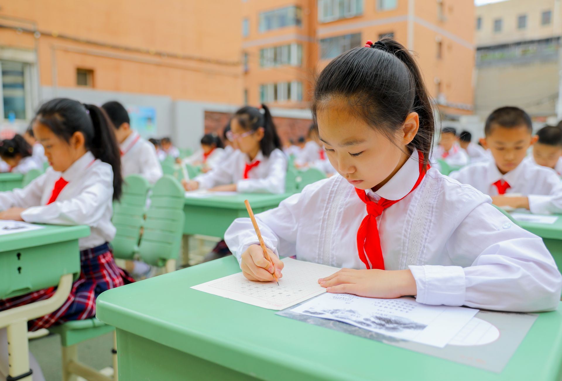 6月13日,呼和浩特市玉泉區(qū)恒昌店巷小學(xué)的學(xué)生們正在參加書法比賽。當(dāng)日,該校“校園書法文化節(jié)”漢字書寫大賽開賽,200多名學(xué)生在硬筆和軟筆項(xiàng)目上展開比拼?;顒?dòng)旨在提高孩子們漢字書寫水平,弘揚(yáng)中華民族優(yōu)秀傳統(tǒng)文化。