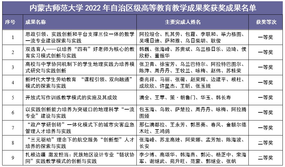北疆新聞網(wǎng)、北疆新聞APP、北疆云消息(記者 李艷紅)近日,內(nèi)蒙古自治區(qū)教育廳發(fā)布了《關(guān)于公布2022年自治區(qū)級(jí)高等教育教學(xué)成果獎(jiǎng)獲獎(jiǎng)成果的通知》,內(nèi)蒙古師范大學(xué)微官網(wǎng)由數(shù)學(xué)科學(xué)學(xué)院牽頭、黨委書記阿拉坦倉主持的《思政引領(lǐng)、實(shí)踐創(chuàng)新和平臺(tái)支撐三位一體的數(shù)學(xué)一流專業(yè)建設(shè)與實(shí)踐》等17個(gè)推薦至自治區(qū)的教學(xué)成果均獲獎(jiǎng),實(shí)現(xiàn)了100%的獲獎(jiǎng)率。其中,一等獎(jiǎng)7項(xiàng),二等獎(jiǎng)4項(xiàng),三等獎(jiǎng)6項(xiàng)。一等獎(jiǎng)獲獎(jiǎng)數(shù)量及總獲獎(jiǎng)率位居全區(qū)之首。