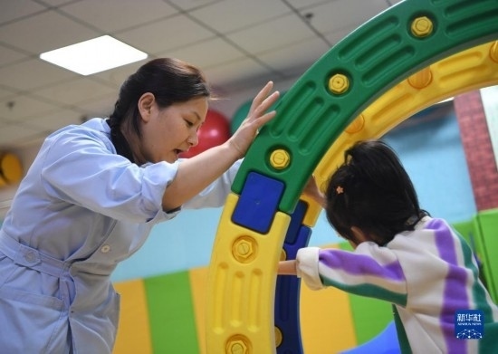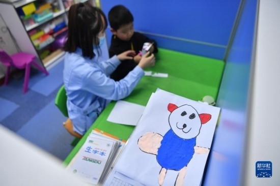 3月30日,在西安市金色陽光康復(fù)中心,特教老師(左)指導(dǎo)孩子進行康復(fù)訓(xùn)練。