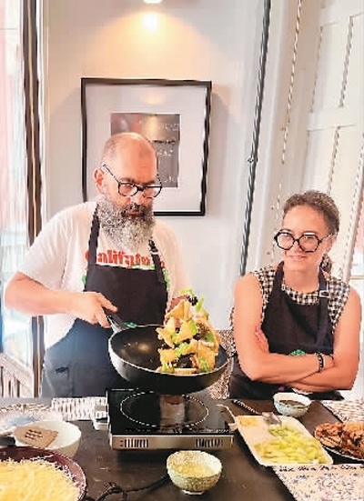 學(xué)員米蓋爾(左)和妻子參加由格大孔院開設(shè)的中華廚藝課。