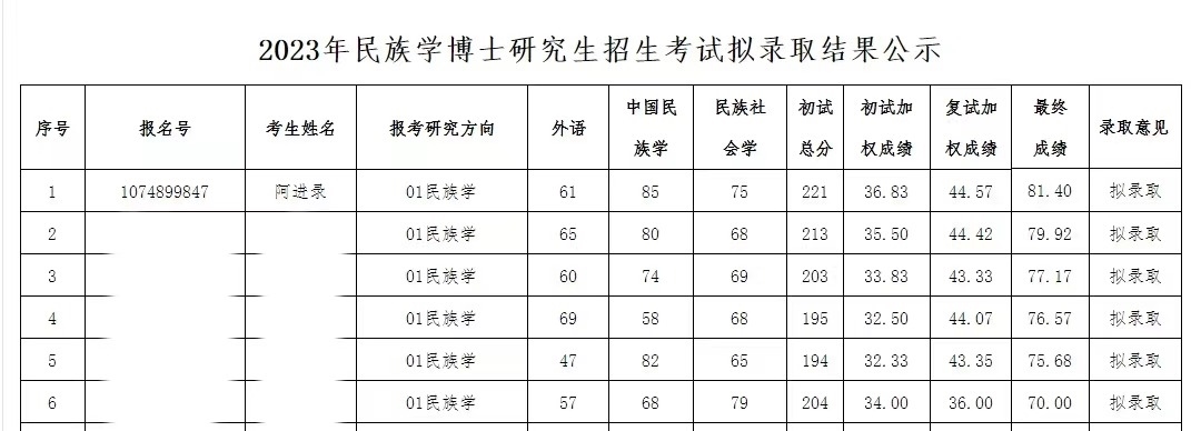 記者了解到,4月9日,青海民族大學(xué)研究生院官方網(wǎng)站發(fā)布《青海民族大學(xué)2023年民族學(xué)博士研究生招生考試擬錄取結(jié)果公示》。該公示稱,經(jīng)2023年青海民族大學(xué)博士招生工作領(lǐng)導(dǎo)小組審議通過,擬錄取17位考生為民族學(xué)博士研究生。根據(jù)公示,考生阿進(jìn)錄以最終成績81.40分進(jìn)入擬錄取名單,在民族學(xué)(報(bào)考研究方向)擬錄取的6名考生中排名第一。(李依環(huán)、實(shí)習(xí)生遇鏡霖)