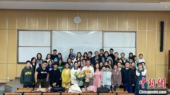 4月27日,臺灣輔仁大學中文系教授孫永忠在北京師范大學作講座,兩個多小時的講座結(jié)束,意猶未盡的學子們涌向講臺,爭相與孫永忠合影留念。 中新社記者 朱賀 攝
