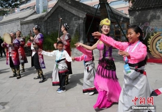 觀看演出時(shí),孩子們與來(lái)參加演出的民族藝術(shù)家們共同跳舞。中新社記者 崔楠 攝
