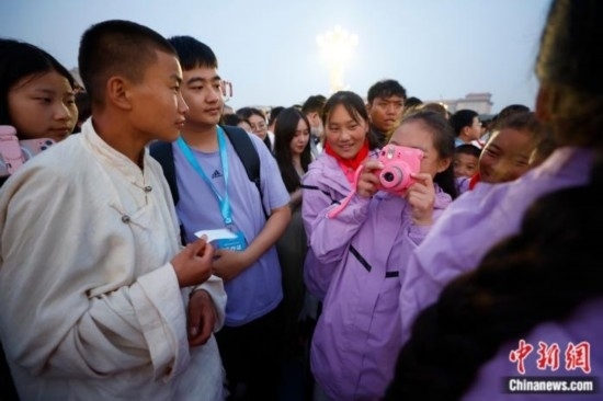 6月1日清晨的天安門廣場(chǎng),一群來(lái)自青海玉樹、身著傳統(tǒng)藏族服飾的孩子組成了一道亮麗的風(fēng)景線。