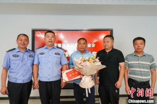 宿遷市公安局宿豫分局和宿豫區(qū)見(jiàn)義勇為基金會(huì)為丁成闖送上見(jiàn)義勇為表彰證書(shū)和慰問(wèn)金。宿豫區(qū)委宣傳部供圖