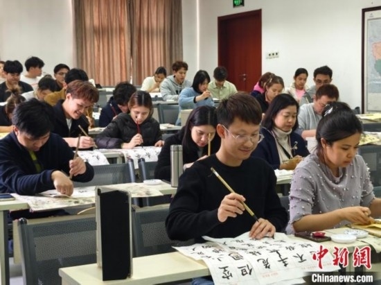 4月3日,在北京華文學院學習的泰國學員在上書法課。(中新網(wǎng)記者韓輝 攝)