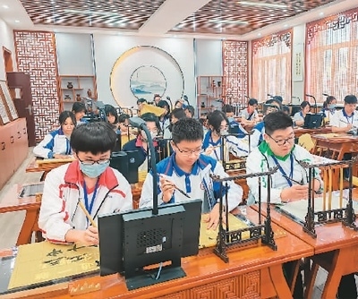 | 5月7日,參加“寧夏歷史文化、自然資源與環(huán)境保育探索之旅”交流活動(dòng)的香港中學(xué)生在寧夏銀川市第六中學(xué)學(xué)寫毛筆字。新華社記者 艾福梅攝 |