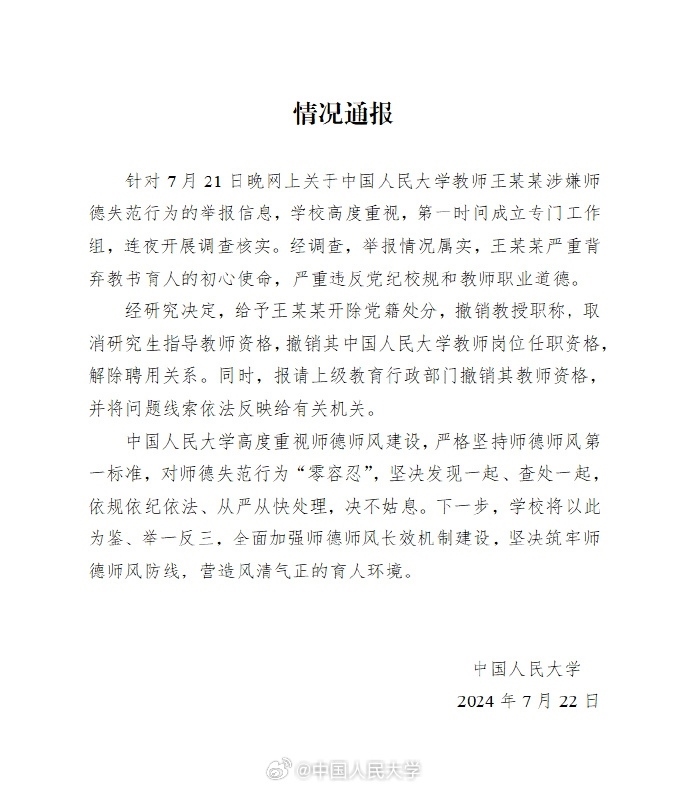 通報(bào)中稱,學(xué)校高度重視,第一時(shí)間成立專門工作組,連夜開(kāi)展調(diào)查核實(shí)。經(jīng)研究決定,給予王某某開(kāi)除黨籍處分,撤銷教授職稱,取消研究生指導(dǎo)教師資格,撤銷其中國(guó)人民大學(xué)教師崗位任職資格,解除聘用關(guān)系。同時(shí),報(bào)請(qǐng)上級(jí)教育行政部門撤銷其教師資格,并將問(wèn)題線索依法反映給有關(guān)機(jī)關(guān)。