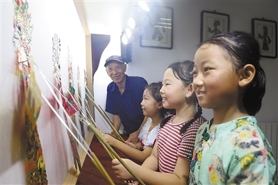 非遺體驗(yàn)河北省唐山市豐潤(rùn)區(qū)浭陽街道華府社區(qū)開設(shè)“非遺”小課堂,小朋友們?cè)趯W(xué)習(xí)表演皮影戲。 朱大勇攝(人民視覺)
