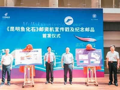 2023年5月,《昆明魚化石》郵資機(jī)宣傳戳及系列紀(jì)念郵品在西北大學(xué)博物館首發(fā)。此次啟用的《昆明魚化石》郵資機(jī)宣傳戳,是以中國科學(xué)院院士、西北大學(xué)教授舒德干團(tuán)隊發(fā)現(xiàn)的鳳姣昆明魚化石為原型設(shè)計制作。鳳姣昆明魚距今已5.18億年,是已知最古老的脊椎動物。該魚的發(fā)現(xiàn),為揭示寒武紀(jì)大爆發(fā)奧秘、破解遠(yuǎn)古生命演化謎團(tuán)提供了獨特的劃時代里程碑證據(jù)。圖為首發(fā)儀式現(xiàn)場。中新社發(fā)