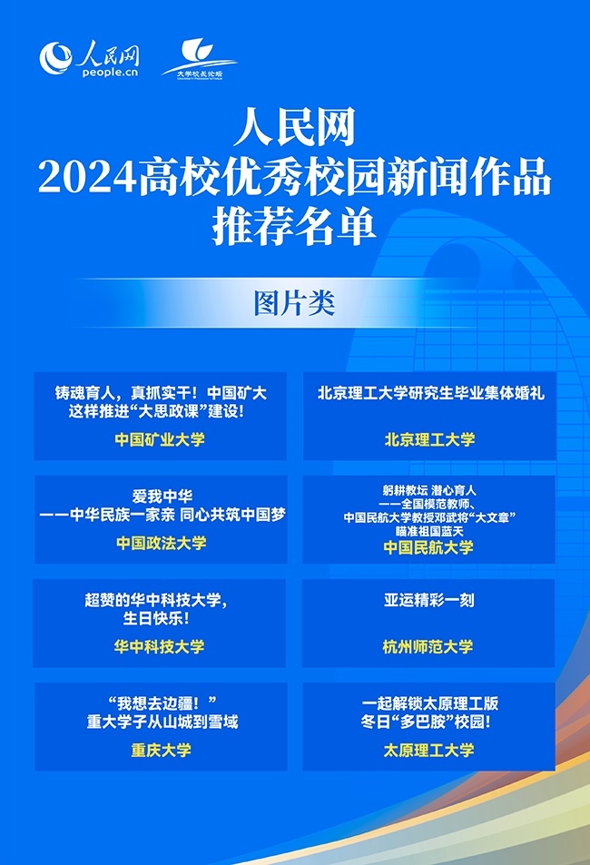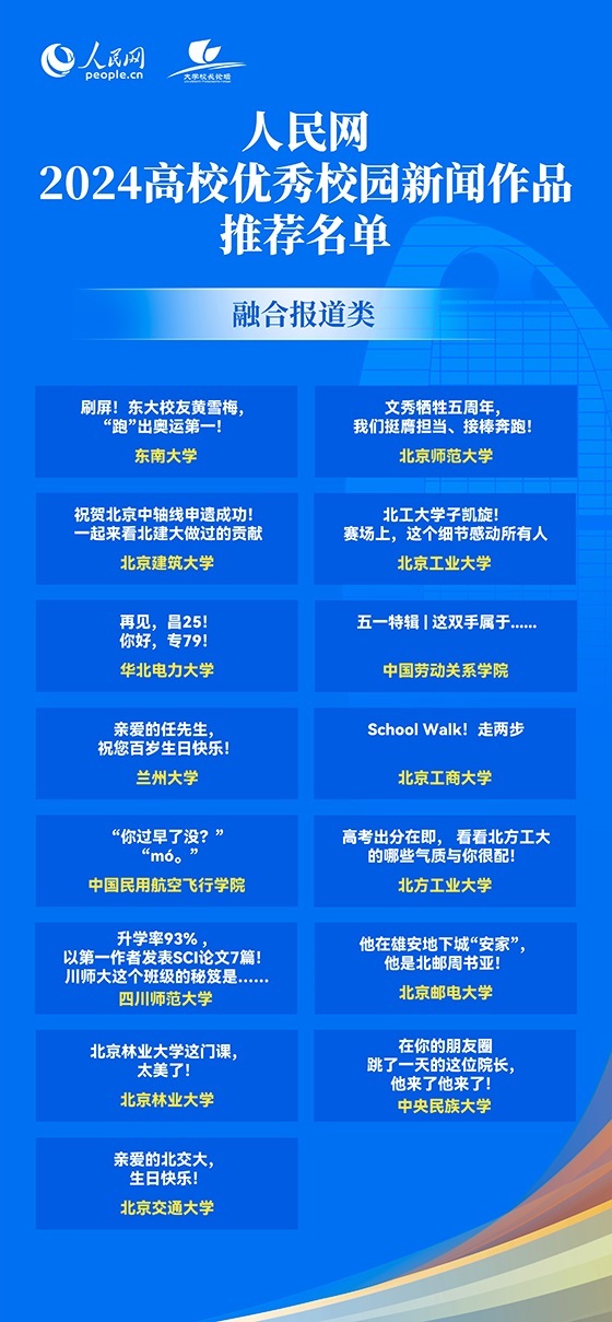 人民網(wǎng)北京12月27日電 (記者孫競、李依環(huán))以“推進(jìn)教育科技人才一體發(fā)展 加快建設(shè)教育強(qiáng)國”為主題的人民網(wǎng)2024大學(xué)校長論壇27日在人民網(wǎng)“初心”報(bào)告廳舉行。論壇上,人民網(wǎng)2024年高校優(yōu)秀校園新聞作品發(fā)布,50所高校作品入選。