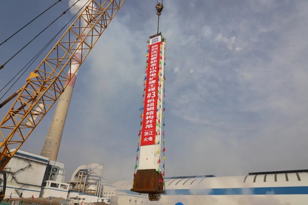 3號機組鍋爐首根鋼結(jié)構吊裝就位
