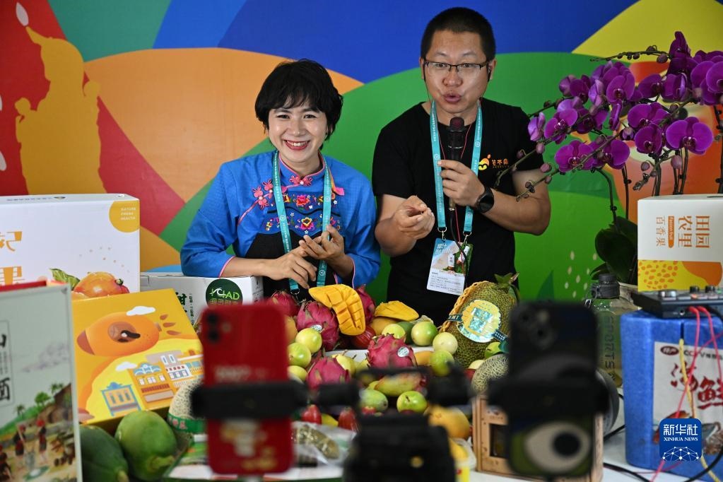 12月15日,海南三亞展臺的工作人員在直播銷售農(nóng)產(chǎn)品。新華社記者 郭程 攝