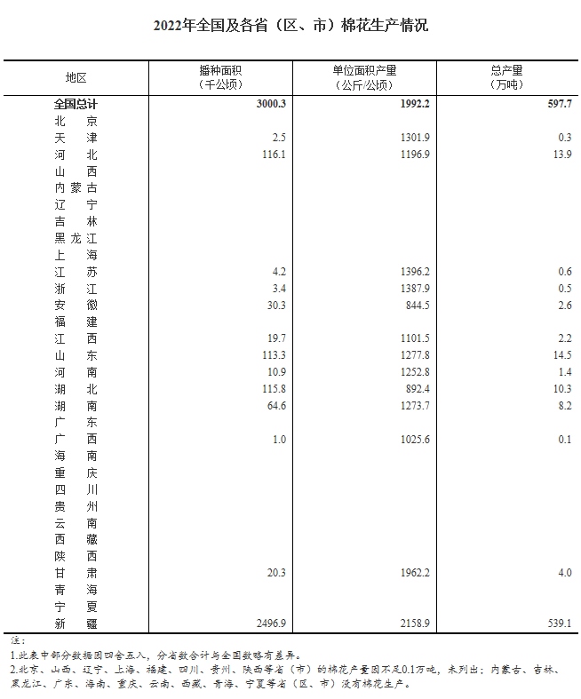 國家統(tǒng)計局26日公布數(shù)據(jù)顯示,根據(jù)對全國31個省(區(qū)、市)的統(tǒng)計調(diào)查(新疆棉花播種面積通過遙感測量取得),2022年全國棉花播種面積4500.4萬畝,比上年減少41.8萬畝,下降0.9%;單產(chǎn)132.8公斤/畝,比上年增加6.6公斤/畝,增長5.3%;產(chǎn)量597.7萬噸,比上年增加24.6萬噸,增長4.3%。