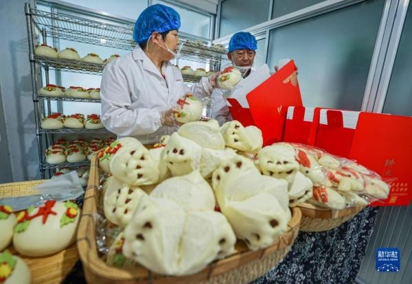 1月11日,在榮成市崖頭街道玉龍社區(qū)一處花餑餑制作坊,工作人員將花餑餑打包、裝箱。新華社發(fā)(李信君 攝)