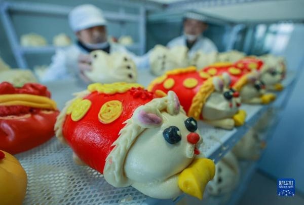 1月11日,在榮成市崖頭街道榮安社區(qū)一處花餑餑制作坊,工作人員在擺放蒸制好的“兔頭”花餑餑和棗餑餑。新華社發(fā)(李信君 攝)
