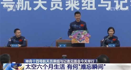 記者會(huì)上,航天員陳冬收到了來自家鄉(xiāng)特殊教育學(xué)校孩子的一幅畫作。