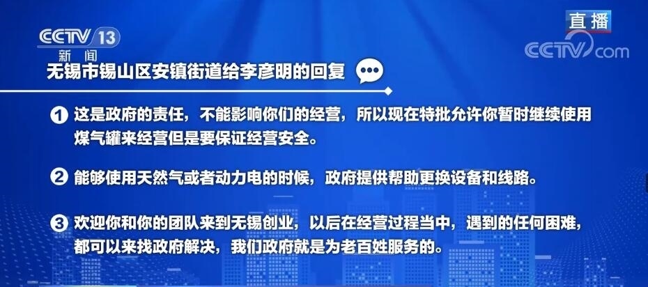 白巖松:首先我們來(lái)看看安鎮(zhèn)街道給李彥明的回復(fù)當(dāng)中的一些關(guān)鍵詞,第一個(gè),這是政府的責(zé)任,不能影響你們的經(jīng)營(yíng)。第二個(gè)里頭包括能夠使用天然氣或者動(dòng)力電的時(shí)候,政府提供幫助更換設(shè)備和線路。在第三里頭有我們政府就是為老百姓服務(wù)的。咱們接下來(lái)馬上連線一下當(dāng)事人,無(wú)錫市錫山區(qū)安鎮(zhèn)街道商務(wù)科的科長(zhǎng)鄒祎,就是他幫著辦的這個(gè)事情。鄒科長(zhǎng)您好!您當(dāng)然感受得到您火了,在網(wǎng)上也被網(wǎng)友表?yè)P(yáng),我特別想知道您的領(lǐng)導(dǎo)表?yè)P(yáng)您沒(méi)有?