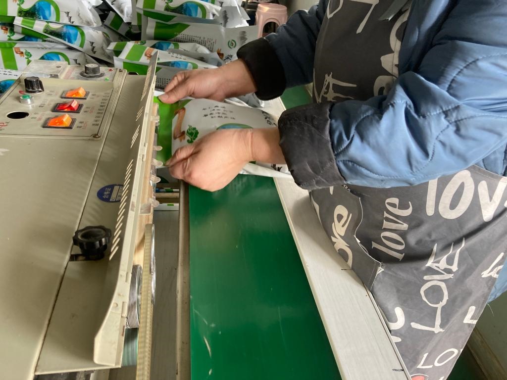 悅來(lái)頤和食用菌種植專(zhuān)業(yè)合作社社員在進(jìn)行猴頭菇產(chǎn)品包裝塑封。新華社記者 金地 攝