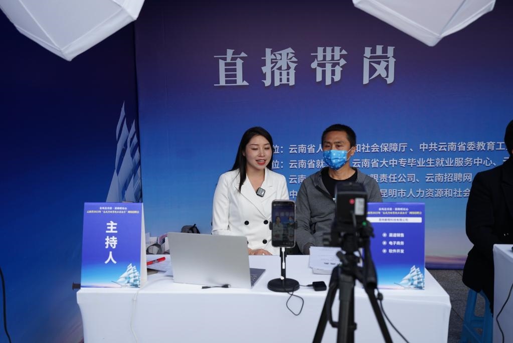 2023年3月3日,在云南省2023年春風(fēng)行動(dòng)暨就業(yè)援助月專場招聘活動(dòng)現(xiàn)場,工作人員“直播帶崗”。新華社記者 佟璐 攝