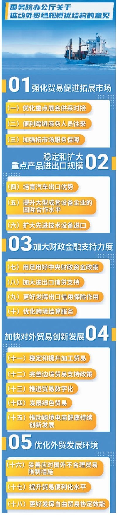 聚焦穩(wěn)規(guī)模,外貿(mào)“18條”突出創(chuàng)造貿(mào)易機(jī)會的同時,強(qiáng)調(diào)穩(wěn)定和擴(kuò)大重點(diǎn)產(chǎn)品貿(mào)易。
