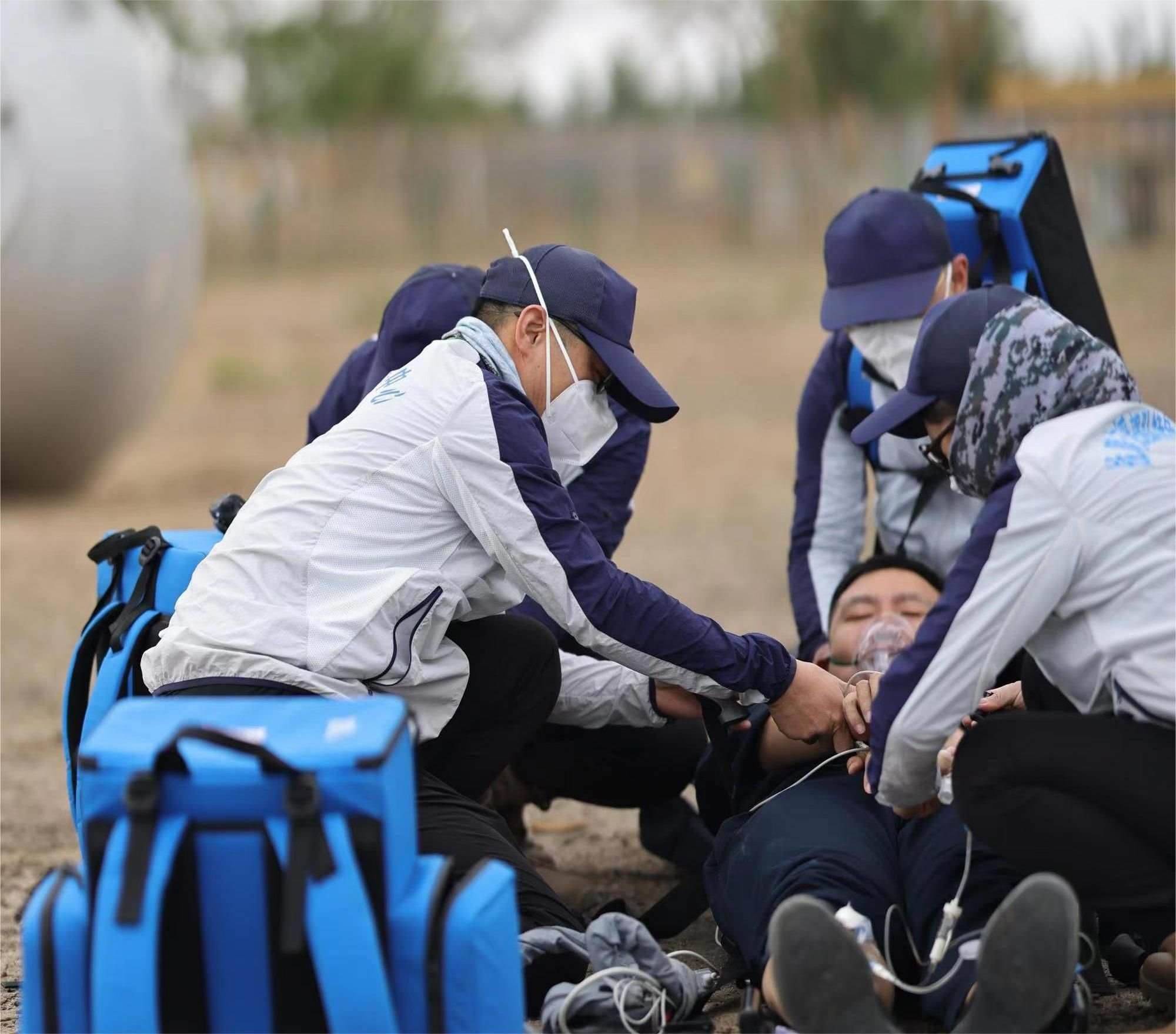 醫(yī)學(xué)急救“白金10分鐘、黃金1小時”,針對可能出現(xiàn)的飛船返回偏離落點,落在沙漠、山地、湖泊,搜救直升機無法降落,車輛無法進(jìn)入的情況,為快速到達(dá)著陸地點,醫(yī)療救護(hù)隊員每天隨身攜帶艙前急救設(shè)備堅持訓(xùn)練六七個小時,負(fù)重在沙漠、山地中奔跑,爭取最短時間展開緊急救治。夏日戈壁驕陽似火,風(fēng)沙彌漫,訓(xùn)練一天下來,隊員們耳朵眼里都是沙土,臉上脖子全是泥印,一個個都成了泥人。茫茫大草原記錄了神舟載人飛行任務(wù)醫(yī)療隊員們一次次醫(yī)療救護(hù)空地協(xié)同演練、全域協(xié)同演練的身影……