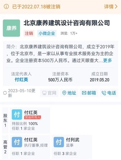 在付列武成為中冶吉信和康和信兩家公司一把手的一周之后,康和信就全資收購了一家個(gè)人獨(dú)資企業(yè)北京康養(yǎng)建筑設(shè)計(jì)咨詢有限公司,被收購的北京康養(yǎng)公司的監(jiān)事是付列武自己,法定代表人是付紅英,付紅英100%持股北京康養(yǎng)建筑設(shè)計(jì)咨詢有限公司。