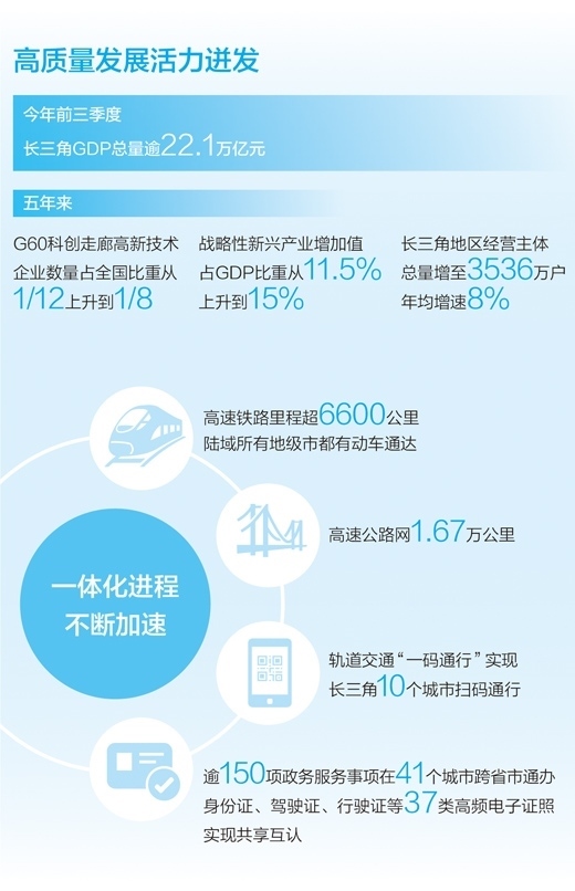 今年前三季度,長三角GDP總量逾22.1萬億元,占全國GDP總量比重較2022年同期有所提升,三省一市經(jīng)濟增速均超過了全國平均水平;作為長三角一體化發(fā)展國家戰(zhàn)略的先手棋和突破口,長三角生態(tài)綠色一體化發(fā)展示范區(qū)掛牌以來,共形成136項務(wù)實有效的制度創(chuàng)新成果,其中38項已面向全國復(fù)制推廣;已有逾150項政務(wù)服務(wù)事項可在長三角41個城市跨省市通辦,實現(xiàn)身份證、駕駛證、行駛證等37類高頻電子證照的共享互認(rèn)……
