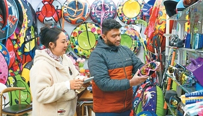 浙江義烏國際商貿(mào)城一家戶外滑雪用具店鋪內(nèi),外商在洽談、選購戶外冰雪運(yùn)動(dòng)裝備。