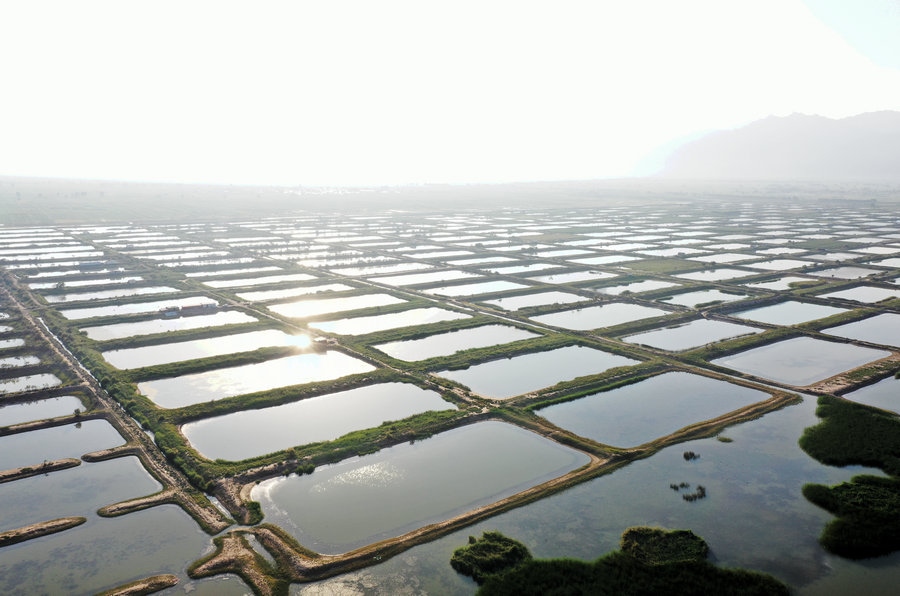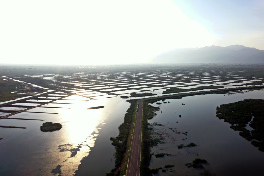 夏日的哈素海濕地,湖水清波蕩漾,水鳥嬉戲成群,山湖相映,一派生機。