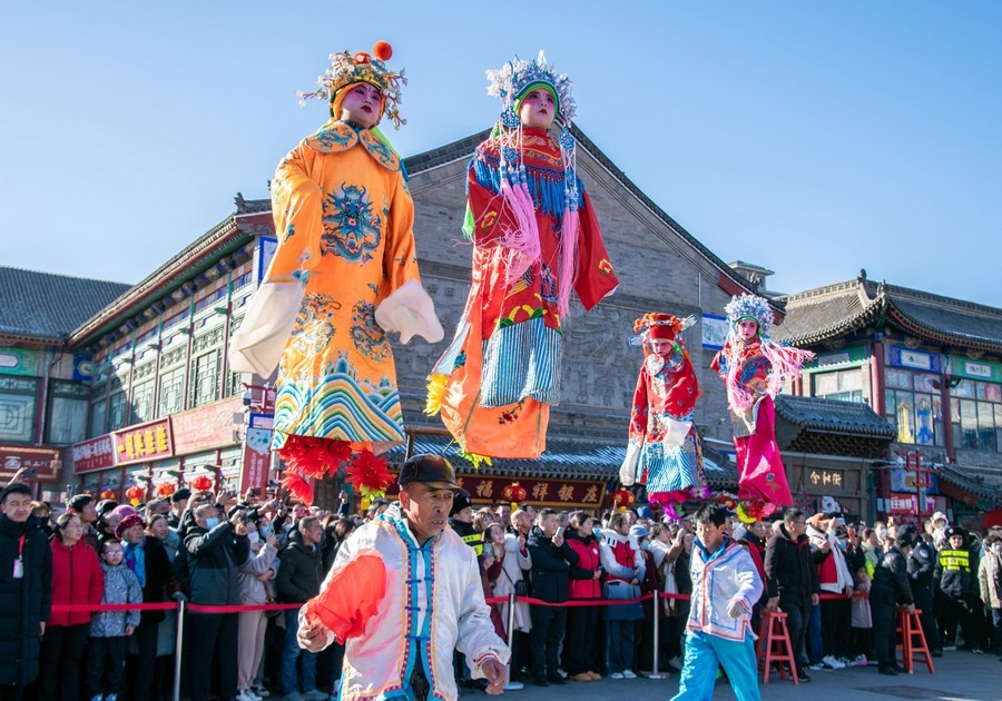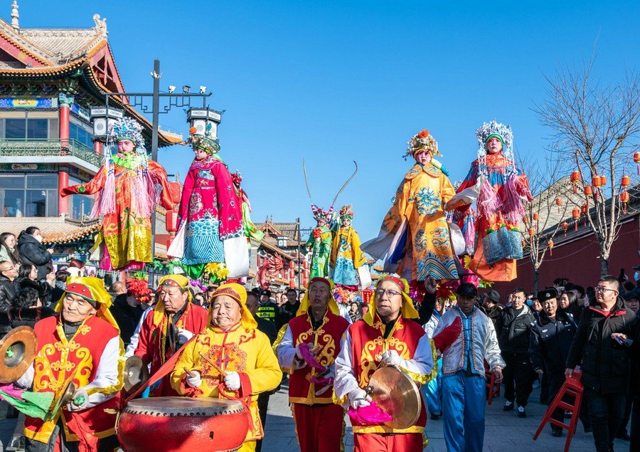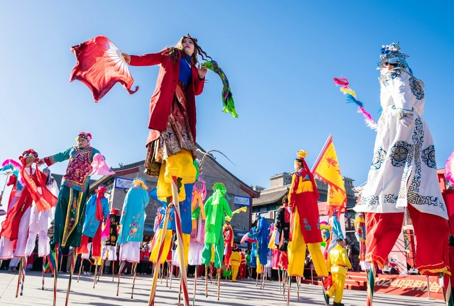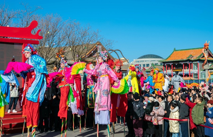 2024年2月15日,民間藝人在呼和浩特新春文化廟會現(xiàn)場進(jìn)行踩高蹺表演。丁根厚 攝