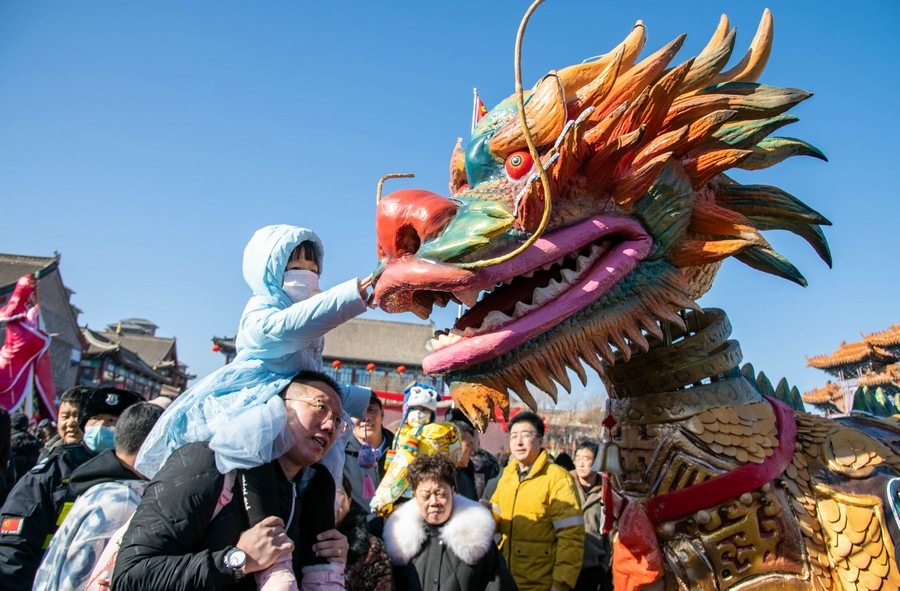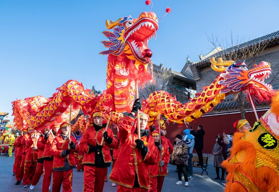 2024年2月15日,民間藝人在呼和浩特新春文化廟會現(xiàn)場進(jìn)行舞龍表演。丁根厚 攝