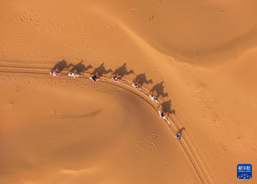 8月1日,游客在達(dá)拉特旗銀肯塔拉沙漠景區(qū)騎駱駝(無人機(jī)照片)。