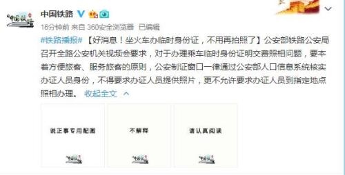 同時(shí),公安部鐵路公安局還要求,對(duì)辦理乘車臨時(shí)身份證明相關(guān)公告、須知等再次進(jìn)行排查,清理辦證需提供照片相關(guān)內(nèi)容。