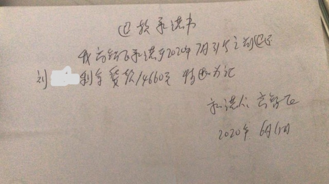 為了不耽誤婚房裝修,劉先生又在居然之家選擇了其他品牌的衛(wèi)浴,并向高經(jīng)理提出退回未付貨的14660元貨款。但高經(jīng)理表示最近手里沒錢,不過,他答應(yīng)劉先生,在7月31日前會(huì)全部退還,并且當(dāng)場(chǎng)寫了一個(gè)退款承諾書。