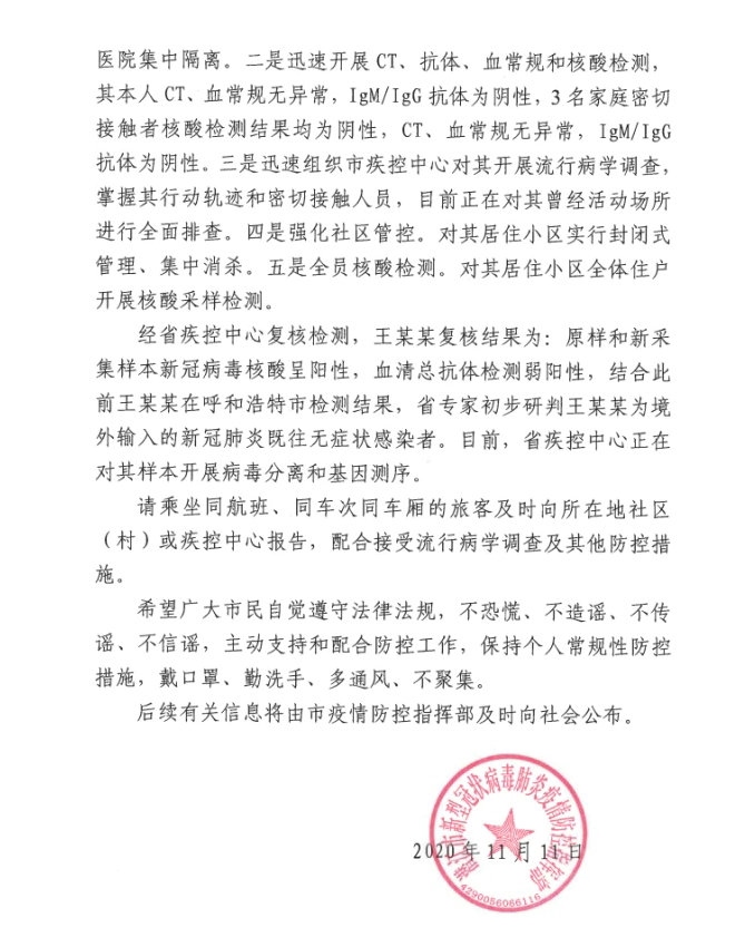 王某,男,于2020年10月17日從哈薩克斯坦阿克托別市經白俄羅斯明斯克州乘坐CA722航班抵達呼和浩特市。10月17日至31日在呼和浩特市境外入呼人員集中隔離酒店單人單間集中隔離,10月17日經呼和浩特海關核酸檢測(咽拭子)陰性,31日經呼和浩特市疾控中心核酸檢測(咽鼻混合拭子)陰性。11月1日王某集中隔離期滿,乘坐專用大巴至白塔機場,經機場專用通道乘坐ZH9128航班抵達武漢天河機場后,乘地鐵、動車、私家車返回潛江市家中。王某在呼集中隔離期間,嚴格按照《新型冠狀病毒肺炎防控方案(第七版)》及入境人員管理要求落實了管控措施。